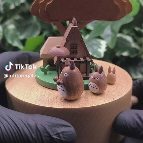 Adorable carrusel musical con mecanismo a cuerda. La caja de música gira 360 grados con divertidos movimientos, acompañados de pequeños personajes de Totoro. Gira el resorte inferior varias veces en sentido horario y, gracias al magnetismo, los personajes magnéticos rodearán la parte superior de la caja mientras reproducen una hermosa melodía.